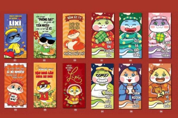 Phong cách minh họa dễ thương mang đến sự vui tươi và ấm áp, rất phù hợp cho trẻ em hoặc gia đình muốn tạo không khí Tết gần gũi. Những nhân vật chibi, hoạt cảnh đón Tết và gam màu tươi sáng giúp mẫu lì xì trông sinh động và thân thiện. AI Gemini tạo nét vẽ mềm mại, biểu cảm đáng yêu và bố cục hài hòa nên rất thích hợp cho các mẫu lì xì bán lẻ hoặc dùng trong các hoạt động gia đình.