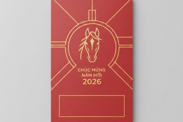 Prompt gợi ý: Modern minimalist red envelope design for Lunar New Year 2026 with a clean layout, soft red background, thin gold geometric accents, subtle Tet elements, elegant brand space, premium corporate tone, high resolution, print ready.