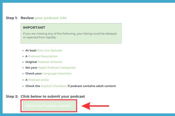 Khi tất cả điều kiện đã được đáp ứng, bạn chỉ cần kéo xuống cuối trang và nhấn vào nút Submit Your Podcast to Spotify. Buzzsprout sẽ thay bạn thực hiện toàn bộ quá trình gửi Podcast đến Spotify.