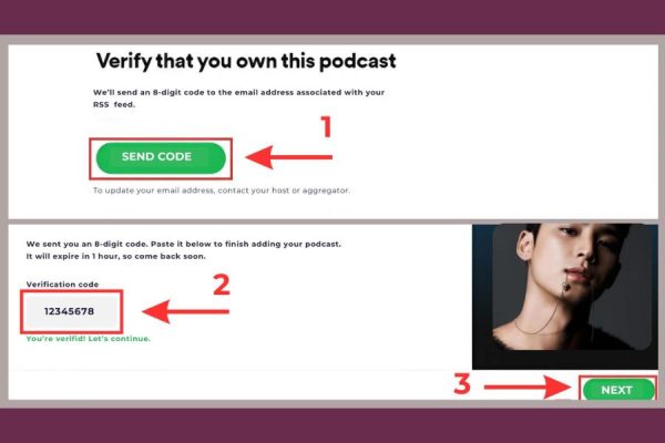 Sau khi kiểm tra email và nhận mã, bạn nhập mã xác minh vào ô yêu cầu trên Spotify for Podcasters, rồi nhấn NEXT. Đây là bước bắt buộc nhằm bảo vệ bản quyền và tránh tình trạng đăng tải Podcast trái phép.