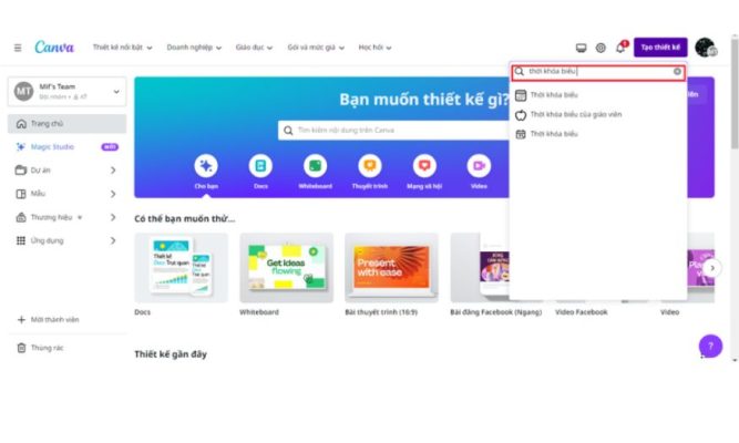 Khi đã đăng nhập thành công, tại giao diện chính của Canva, bạn sẽ thấy ô tìm kiếm ở phía trên cùng. Hãy nhập từ khóa “Thời khóa biểu” (hoặc “Schedule” nếu dùng giao diện tiếng Anh) vào ô này. Ngay lập tức, Canva sẽ hiển thị hàng nghìn mẫu thời khóa biểu đa dạng với nhiều phong cách khác nhau, từ đơn giản, hiện đại cho đến dễ thương, sáng tạo.