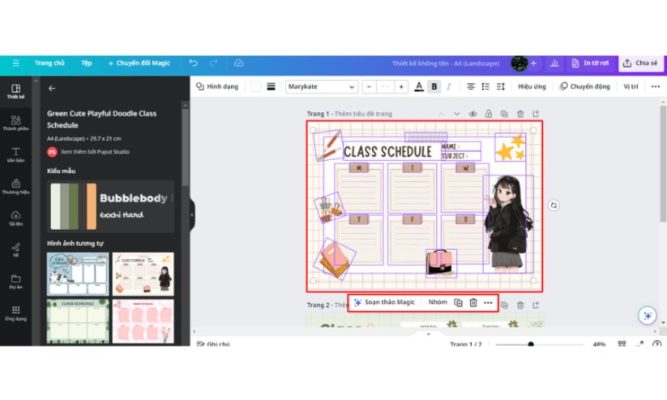 Tại trang thiết kế mới, bạn có thể thỏa sức sáng tạo với mẫu thời khóa biểu đã chọn. Canva cung cấp rất nhiều công cụ chỉnh sửa trực quan, dễ thao tác, phù hợp cả với người mới bắt đầu. Đối với hình ảnh, bạn có thể thay đổi vị trí, kích thước, màu sắc hoặc thêm mới các yếu tố đồ họa từ kho tài nguyên miễn phí và trả phí mà Canva cung cấp. Nếu muốn cá nhân hóa hơn, bạn có thể tải ảnh từ thiết bị của mình lên và sử dụng trực tiếp trong thiết kế.