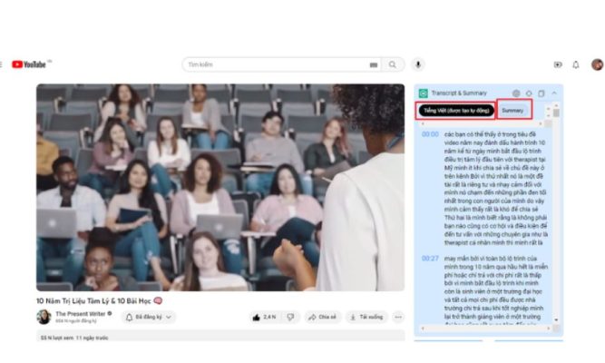 Tiếp theo, hãy mở YouTube và chọn video mà bạn muốn tóm tắt. Ngay phía trên góc phải màn hình, bạn sẽ thấy bảng Transcript & Summary hiện ra. Tại đây, bạn hãy chọn tiếng Việt để toàn bộ nội dung video được hiển thị dưới dạng văn bản, giúp bạn dễ dàng theo dõi và nắm bắt thông tin nhanh chóng.