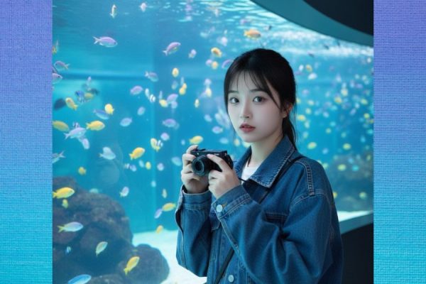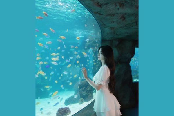 Prompt này rất phù hợp khi bạn muốn có một bức ảnh tạo dáng nhẹ nhàng trước bể cá khổng lồ, với ánh sáng xanh trong phản chiếu lên khuôn mặt và trang phục, mang cảm giác hiện đại và thời trang.