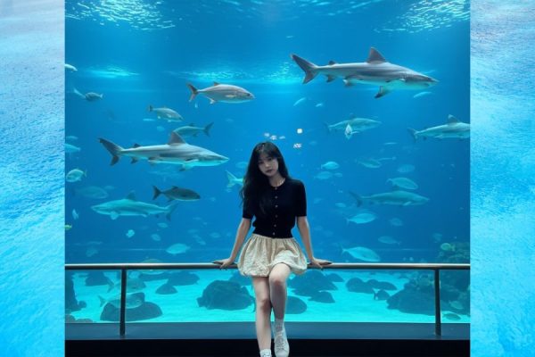 Phong cách này đem đến vẻ hiện đại, năng động và tràn đầy sức sống. Đường hầm thủy cung xanh mát kết hợp cùng outfit lệch vai cá tính tạo nên một khung hình thời trang nhưng vẫn rất tự nhiên.