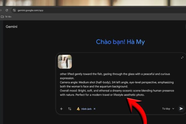 Tiếp theo, bạn chỉ cần chọn một trong những câu lệnh gợi ý phía dưới và dán vào ô mô tả của Gemini. Các prompt được viết sẵn đã tối ưu bố cục, ánh sáng và bối cảnh trong thủy cung, giúp AI dễ dàng hiểu và tạo ra hình ảnh đúng phong cách bạn mong muốn. Nếu thích, bạn có thể chỉnh sửa lại vài chi tiết để phù hợp với phong cách cá nhân.