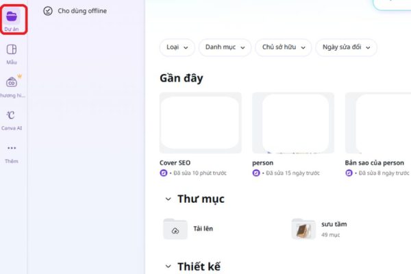 Đầu tiên, hãy mở phần mềm Canva trên máy tính. Khi giao diện chính xuất hiện, bạn chọn mục Dự án hoặc Thiết kế của bạn để hiển thị toàn bộ những file mà bạn từng tạo. Đây là nơi tập trung mọi thiết kế, từ bài thuyết trình, banner, poster đến tài liệu học tập. Tiếp theo, ở thanh menu bên trái, hãy kéo xuống và bạn sẽ thấy mục Thùng rác (Trash) nơi Canva lưu tạm thời các dự án đã bị xóa trong thời gian gần đây.