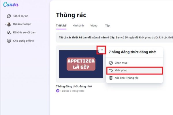 Khi đã tìm thấy dự án cần khôi phục, bạn nhấn vào biểu tượng ba chấm bên cạnh thiết kế đó, sau đó chọn Khôi phục. Ngay lập tức, Canva sẽ đưa dự án trở lại danh sách thiết kế chính, sẵn sàng để bạn tiếp tục chỉnh sửa, tải xuống hoặc chia sẻ.