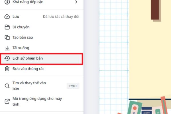 - Nếu dùng Canva phiên bản mobile: Nhấn vào biểu tượng ba chấm ở góc trên bên phải → chọn Lịch sử phiên bản để mở danh sách các phiên bản cũ.