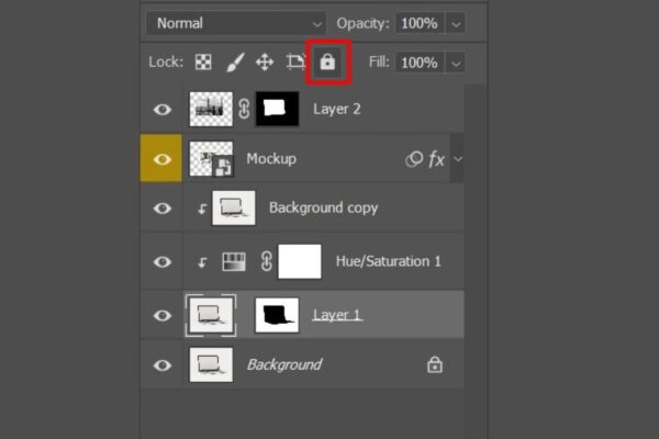 Photoshop mặc định chỉ khóa layer Background, các layer còn lại đều mở.