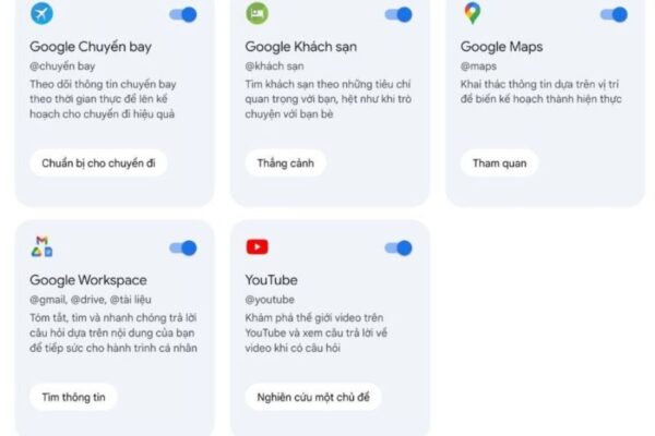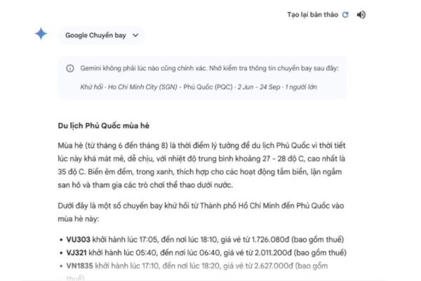 Nhờ tích hợp Google chuyến bay, Gemini có thể hỗ trợ bạn tra cứu và theo dõi thông tin chuyến bay một cách nhanh chóng ngay trong cuộc trò chuyện. Thay vì phải tự truy cập trang web, lọc giá vé, ngày giờ hay so sánh các hãng bay, bạn chỉ cần nói với Gemini mong muốn của mình. Chẳng hạn bạn hỏi “Tìm chuyến bay đến Phú Quốc vào mùa hè này”, Gemini sẽ ngay lập tức tổng hợp danh sách các chuyến bay đang mở bán, gồm giờ khởi hành, mức giá tham khảo và cả những lựa chọn phù hợp với nhu cầu của bạn.