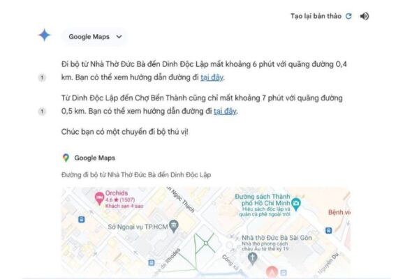 Google Maps là một trong những tính năng mạnh nhất được tích hợp trực tiếp vào Gemini, cho phép bạn hỏi đường, tìm lộ trình tối ưu hoặc xem thông tin về địa điểm chỉ bằng câu thoại. Bạn có thể yêu cầu Gemini chỉ đường đến một địa điểm bất kỳ, gợi ý tuyến đường có ít kẹt xe hơn, hoặc tìm những quán ăn, cửa hàng, địa điểm vui chơi xung quanh nơi bạn đang đứng. Tất cả đều được hiển thị ngay lập tức theo cách dễ hiểu và chính xác.