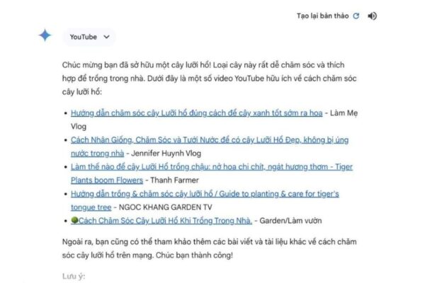 Với YouTube, Gemini giúp bạn tìm video nhanh và chính xác hơn rất nhiều so với việc gõ từ khóa thông thường. Nhờ khả năng hiểu ngữ cảnh, Gemini có thể phân tích yêu cầu của bạn và tìm ra những video phù hợp nhất với mục đích thực sự của bạn. Ví dụ, nếu bạn hỏi “Cách chăm sóc cây lưỡi hổ cho người mới trồng”, Gemini không chỉ đưa ra video ngẫu nhiên mà sẽ chọn các nội dung chi tiết, dễ hiểu và được đánh giá cao.