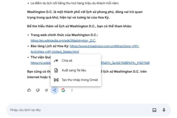 Một tính năng tiện lợi khác của Gemini là khả năng chia sẻ toàn bộ cuộc trò chuyện hoặc từng câu trả lời riêng lẻ. Chỉ với một thao tác, bạn có thể gửi thông tin từ Gemini cho bạn bè, gia đình hoặc đăng lên mạng xã hội. Điều này giúp bạn tiết kiệm rất nhiều thời gian, nhất là khi cần chia sẻ hướng dẫn, kết quả tìm kiếm, lịch trình du lịch hoặc một câu trả lời hữu ích nào đó mà Gemini vừa giải thích.