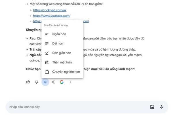 Bạn có thể điều chỉnh phong cách trả lời của Gemini để phù hợp hơn với nhu cầu cá nhân. Chỉ cần nhấn nút sửa đổi, bạn có thể yêu cầu Gemini trả lời ngắn hơn, chi tiết hơn, đơn giản, thân mật hoặc chuyên nghiệp tùy theo bối cảnh. Điều này giúp Gemini tạo ra những phản hồi “đúng ý” hơn, đặc biệt khi bạn cần nội dung dùng trong công việc hoặc giao tiếp.