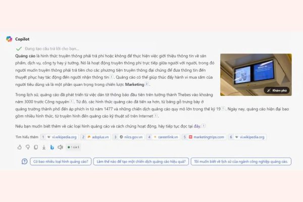 Điểm đáng chú ý là Gemini còn bổ sung phần ví dụ minh họa và phân loại các hình thức quảng cáo, giúp người dùng dễ hình dung. Sự chỉn chu trong trình bày khiến Gemini chiếm ưu thế rõ rệt về trải nghiệm thị giác. Tuy nhiên, ChatGPT lại có lợi thế ở tốc độ phản hồi nhanh và khả năng diễn đạt tự nhiên. Nhìn chung, nếu người dùng muốn tìm hiểu nhanh thì ChatGPT là lựa chọn hợp lý, còn để nghiên cứu sâu hoặc trình bày chuyên nghiệp thì Gemini vượt trội hơn hẳn Copilot và ChatGPT.