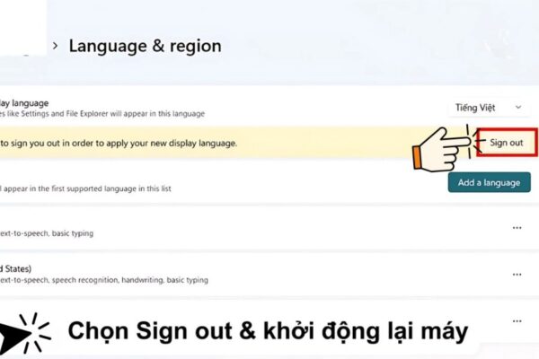 Để khắc phục, bạn vào Settings trên Windows, chọn Time & Language, sau đó nhấn vào Language & Region. Tại mục Add a language, tìm và thêm Tiếng Việt, rồi nhấn Install để tải đầy đủ gói ngôn ngữ. Sau khi cài đặt xong, hãy chọn Tiếng Việt (hoặc ngôn ngữ bạn sử dụng chính) làm Windows Display Language, sau đó nhấn Sign Out để đăng xuất và khởi động lại máy. Khi mở lại CapCut, bạn thử nhập văn bản mới để kiểm tra xem lỗi đã được xử lý chưa.