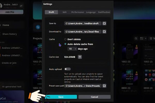 Bạn mở CapCut, nhấn vào biểu tượng Cài đặt (hình bánh răng) trên giao diện chính. Trong mục Performance (Hiệu suất), bạn sẽ thấy thông tin về kích thước bộ nhớ đệm (Cache Size). Nhấn vào biểu tượng thùng rác để xóa các tệp tạm không cần thiết, sau đó chọn Save để lưu thay đổi. Thao tác này không ảnh hưởng đến các dự án đã lưu, nên bạn có thể yên tâm thực hiện. Sau khi xóa cache, hãy đóng và mở lại phần mềm để kiểm tra tính năng nhập văn bản.