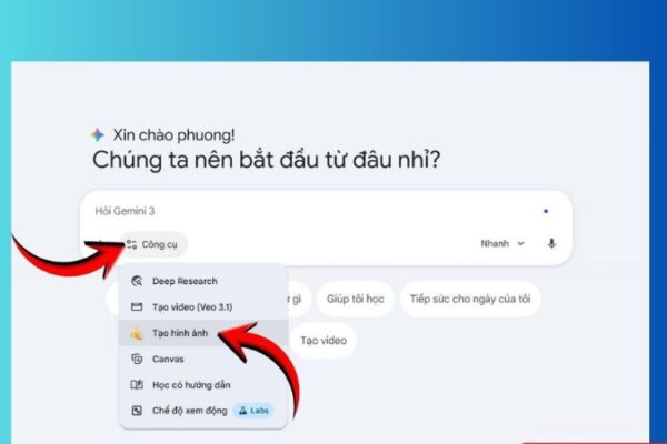 Trước tiên, bạn truy cập Gemini bằng trình duyệt trên máy tính hoặc mở ứng dụng trên điện thoại. Tại giao diện chính, bạn sẽ thấy khung nhập nội dung quen thuộc. Hãy nhìn sang khu vực bên cạnh và chọn mục “Công cụ”, sau đó nhấn vào “Tạo hình ảnh” để kích hoạt chế độ sáng tạo hình ảnh bằng AI.