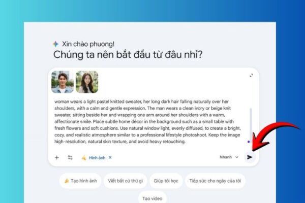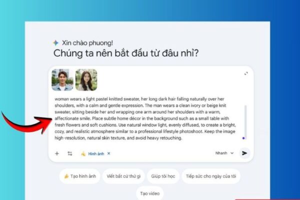 Gemini sẽ hiểu rằng các ảnh bạn tải lên là dữ liệu gương mặt gốc, còn phần mô tả chính là yêu cầu sáng tạo hình ảnh mới. Càng mô tả chi tiết, AI càng dựng được khung cảnh sống động và đúng ý tưởng. Đây chính là bước quyết định sự thành công khi tạo ảnh cặp đôi bằng AI Gemini, vì prompt đóng vai trò như “kịch bản” cho toàn bộ bức ảnh.