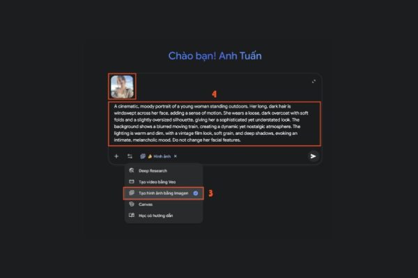 Đây chính là phần “linh hồn” của toàn bộ quá trình. Prompt là câu mô tả chi tiết giúp Gemini hiểu bạn muốn bức ảnh trông như thế nào: tông màu, cảm xúc, ánh sáng, phong cách hay thậm chí là khung cảnh xung quanh. Càng mô tả rõ ràng, ảnh kết quả càng chân thật và mang đúng “chất điện ảnh” mà bạn mong muốn.