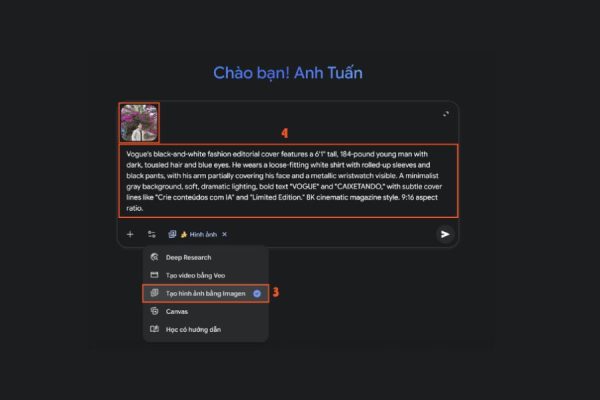 Đây là bước quan trọng nhất, vì chính phần mô tả (prompt) sẽ quyết định vẻ ngoài và phong cách của bức ảnh sau cùng. Hãy viết câu lệnh càng chi tiết càng tốt để Gemini hiểu chính xác bạn mong muốn điều gì: phong cách tạp chí nào, tông màu chủ đạo, kiểu ánh sáng, biểu cảm khuôn mặt, trang phục, phông nền hay thậm chí là bố cục chữ trên bìa tạp chí.