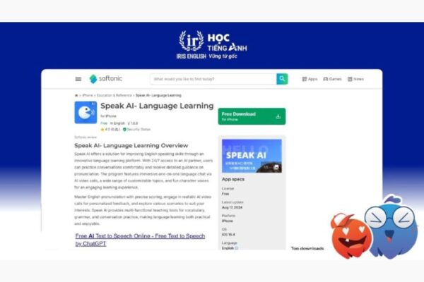 Speak AI là ứng dụng học tiếng Anh tập trung vào luyện nói và hội thoại trực tiếp với AI. Người dùng có thể trò chuyện với AI như đang giao tiếp với người thật, giúp vượt qua rào cản tâm lý và tăng phản xạ khi nói. Ứng dụng cũng có thể phân tích hội thoại, phát hiện lỗi phát âm hoặc cách dùng từ và đưa ra gợi ý chỉnh sửa ngay trong quá trình luyện tập.