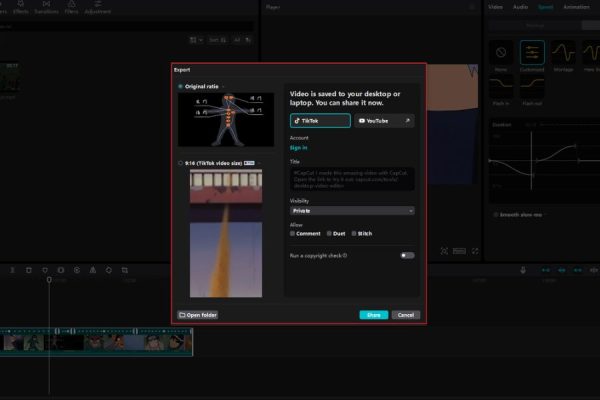 Sau khi hoàn tất chỉnh sửa, CapCut cung cấp tính năng chia sẻ trực tiếp video lên các nền tảng mạng xã hội phổ biến như TikTok, Instagram hay YouTube. Bạn chỉ cần nhấn vào tùy chọn chia sẻ và chọn nền tảng muốn đăng tải, CapCut sẽ tự động tối ưu video về định dạng và chất lượng phù hợp. Nhờ vậy, bạn không chỉ tiết kiệm thời gian mà còn đảm bảo video hiển thị đẹp mắt và mượt mà trên mọi thiết bị.